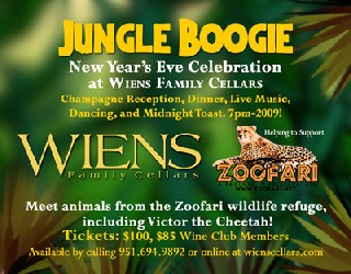 | Details: Wiens Family Cellars, of Temecula will host a “Jungle Boogie” New Year’s Eve Celebration benefiting Zoofari, a local wildlife rescue organization this December 31. The event begins at 7pm and will feature a champagne reception with passed appetizers, a jungle themed dinner, dessert and live music. Guests will be able to meet some of the animals from the refuge including an Albino Burmese Python, Artic Fox, and Victor, the cheetah. The event will close with dancing and a New Year’s Toast at Midnight.